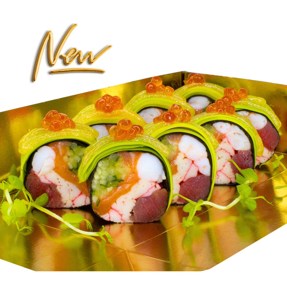 Норі, тунець, сурімі, лосось, креветка, огірок, авокадо, ікра лососева, соус Золотий, мікрогрін, лимон, імбир, васабі, соус Фірмовий