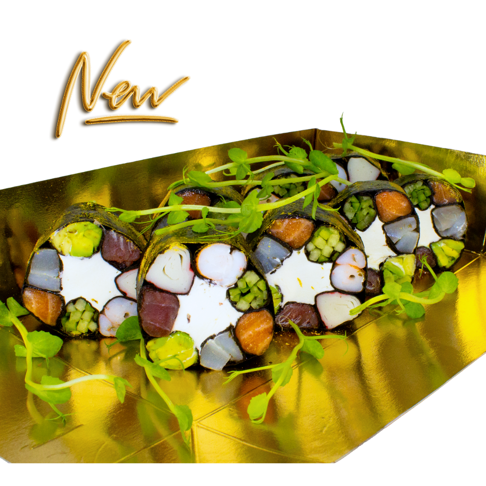 Норі, окунь ізумідай, лосось, тунець, сурімі, креветка, огірок, авокадо, крем-сир, кандурін, мікрогрін, лимон, імбир, васабі, соус Фірмовий