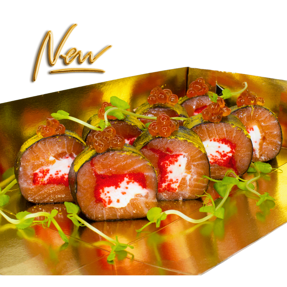 Норі, лосось, крем-сир,ікра червона тобіко, ікра червона лососева, кандурін, мікрогрін, лимон, імбир, васабі, соус Фірмовий