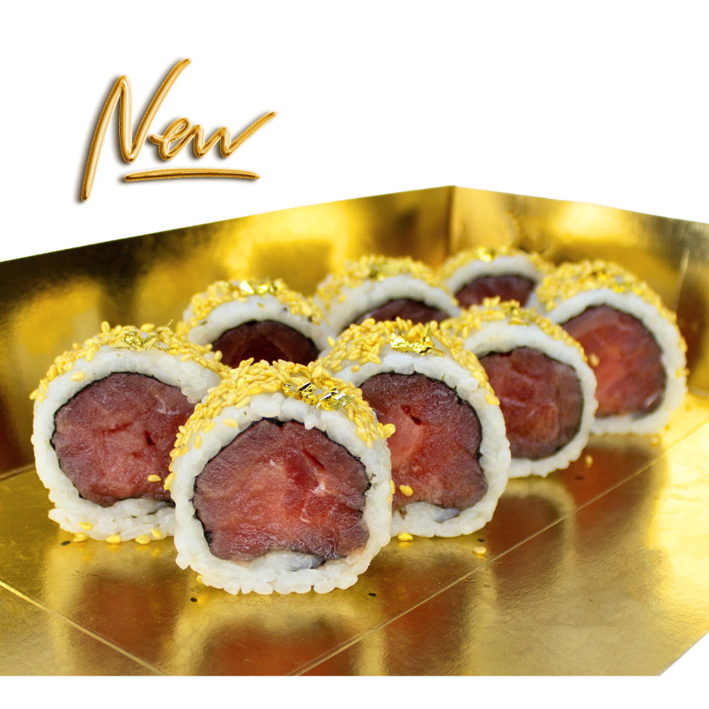 Норі, рис, тунець, сусальне золото, кунжут, мікрогрін, лимон, імбир, васабі, соус Фірмовий