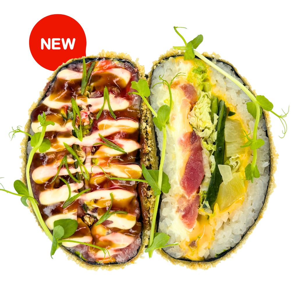Рис, норі, крем сир, сир Чеддер, тунець, огірок, салат, ананас, темпура, панко, соус Унагі, соус Спайсі, соус Наршараб, цибуля зелена, мікрогрін, Соєвий соус