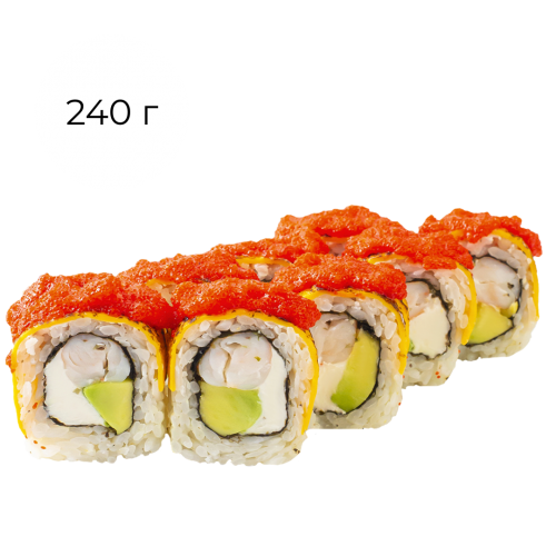 Склад: норі, рис, крем-сир, авокадо, креветка, сир чеддер, тобіко на верх, васабі, соєвий соус, імбир.