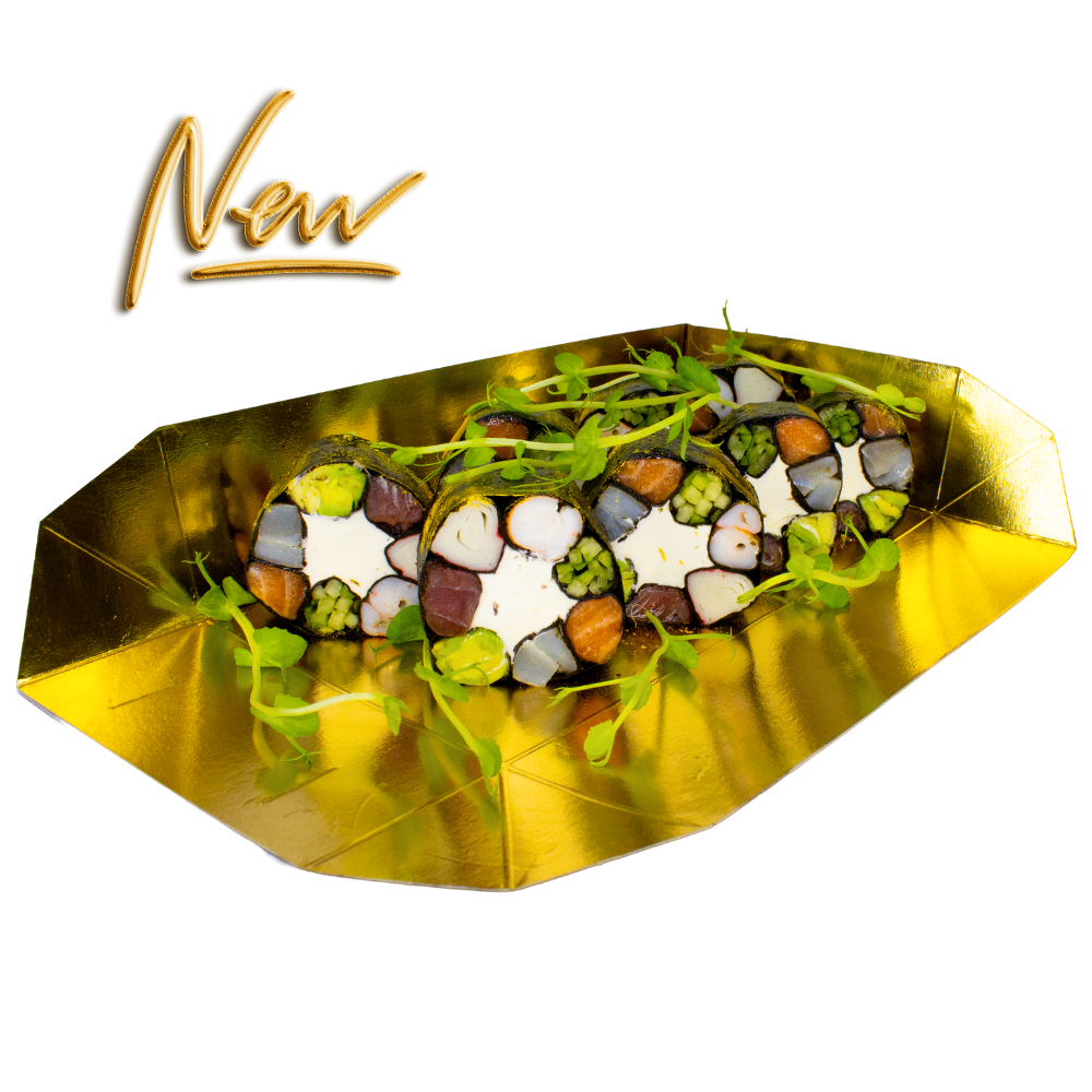 Норі, окунь ізумідай, лосось, тунець, сурімі, креветка, огірок, авокадо, крем-сир, кандурін, мікрогрін, лимон, імбир, васабі, соус Фірмовий