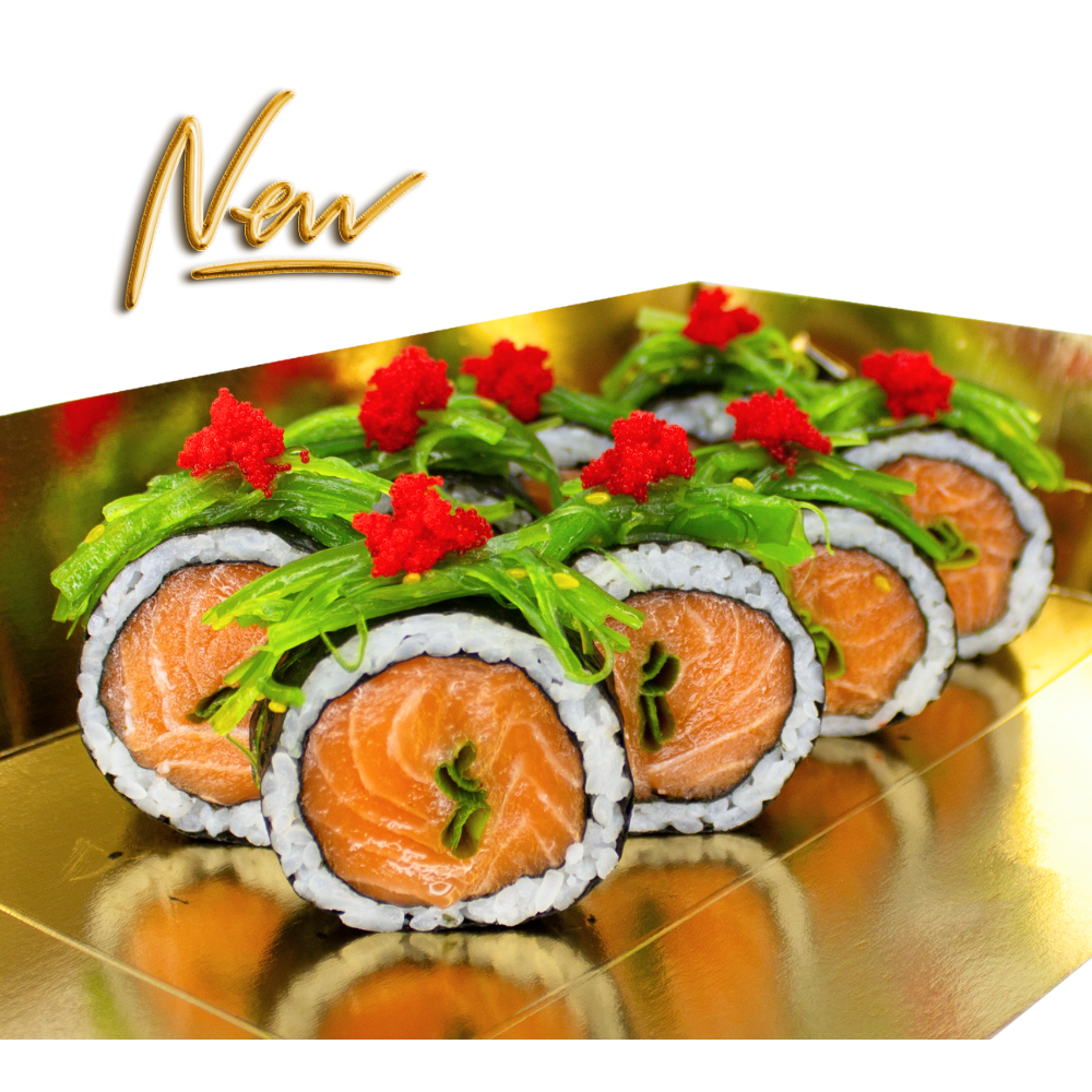 Норі, лосось, крем-сир, ікра червона тобіко, ікра червона лососева, кандурін, мікрогрін, лимон, імбир, васабі, соус Фірмовий