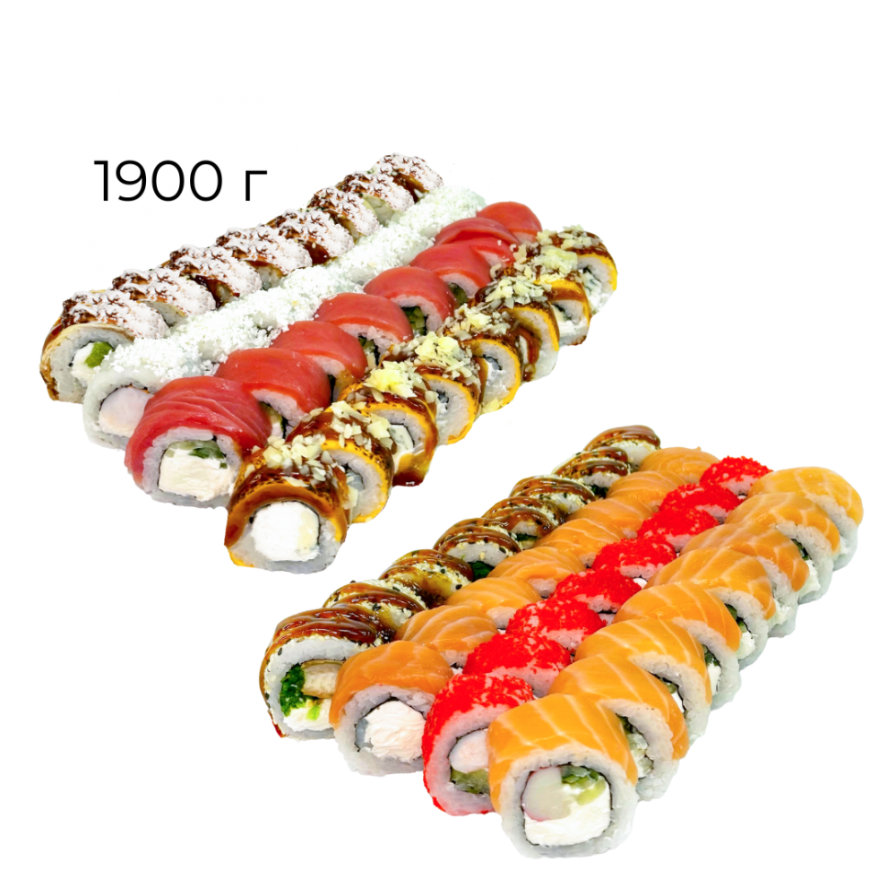 До акційного набору входить: Філадельфія з тунцем, Філадельфія сурімі, Філадельфія унагі ківі, Філадельфія з сиром, Рол чотири сира, Рол Рафаєло, Філадельфія з ікрою та креветками, Філадельфія з вугрем в кунжуті, васабі, соєвий соус, імбир.