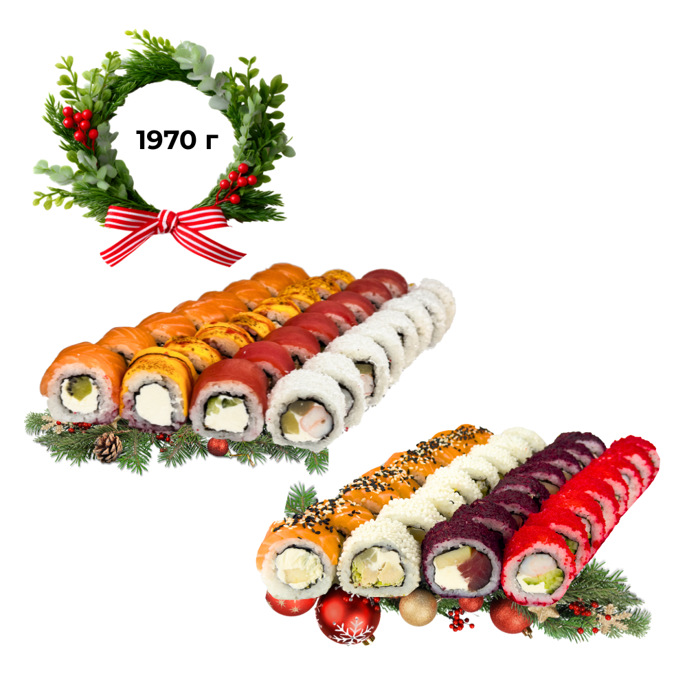 До складу входять: рол Рафаело, Сирний з гранатовим соусом, Філадельфія з ікрою та креветками, Філадельфія з лососем та ківі, рол Тунець смородина, Філадельфія з тунцем, рол Сніжний, Дракон дор блю.