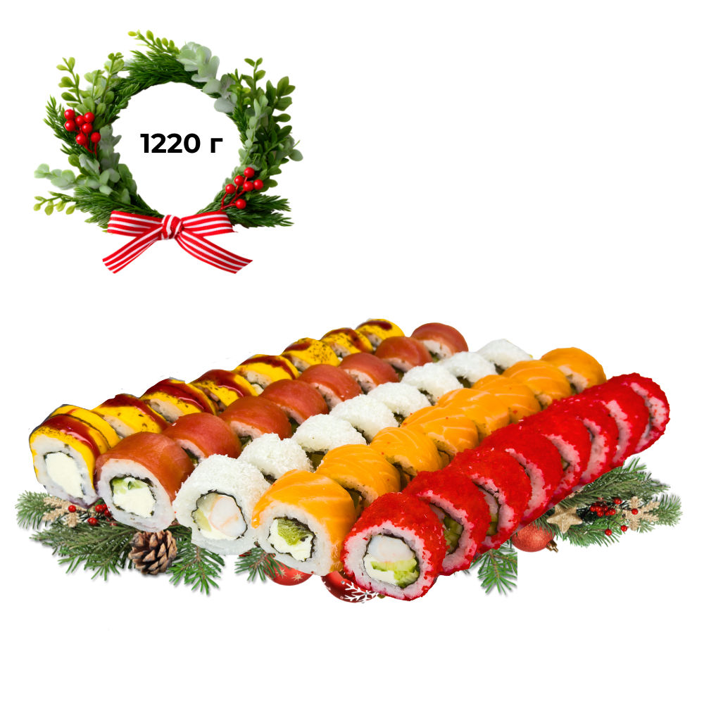 До складу входять: Філадельфія з лососем та ківі, Філадельфія з тунцем, Філадельфія з ікрою та креветками, Сирний з гранатовим соусом, рол Рафаело.