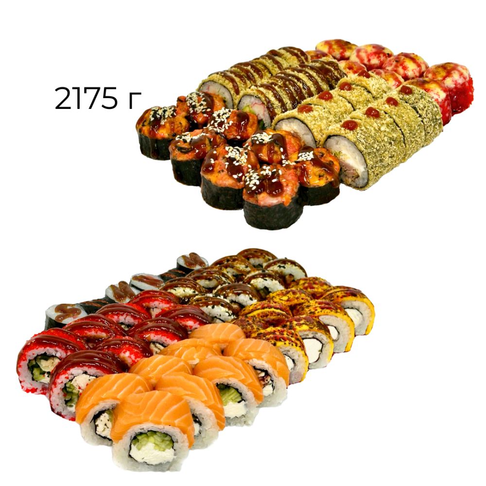 Філадельфія чікен, Філадельфія з лососем, Сирний з гранатовим соусом, Філадельфія з вугрем в кунжуті, Макі з тунцем, Фрі краб рол, Фрі рол зі смаженим тунцем, Хот рол 4 сира, Хот рол мідія та чеддер, імбир, васабі, соєвий соус
