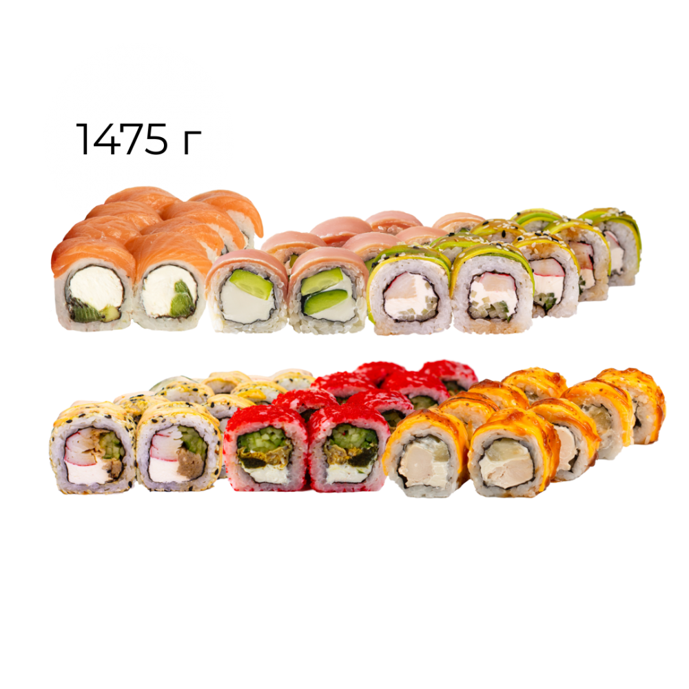 Чікен рол з ананасом,Філадельфія з ікрою та мідіями,Філадельфія з крабом і авокадо,Філадельфія з тунцем,Філадельфія з лососем та ківі,Рол сурімі роял,
