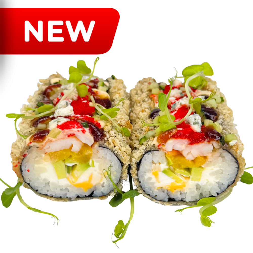 Норі, рис, крем-сир, сир Чеддер, темура, панко, авокадо, креветка, манго, огірок, ікра червона, сир Дор Блю, соус Спайсі, соус Унагі, мікрогрін, імбир, васабі, соєвий соус