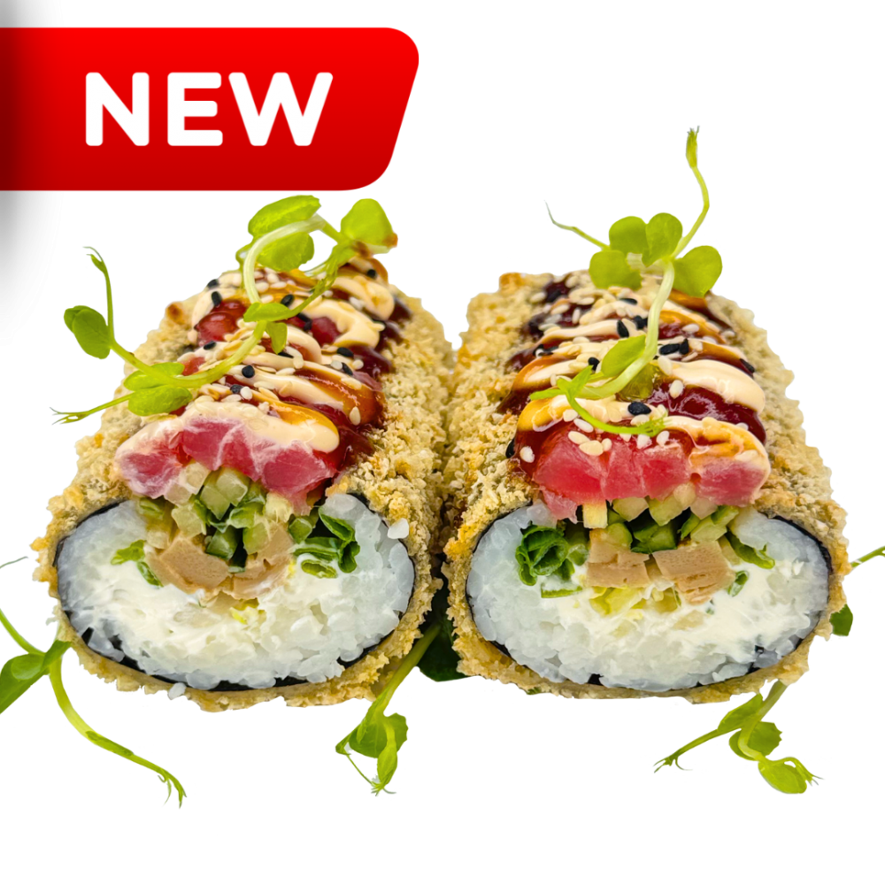 Норі, рис, крем-сир, темпура, панко, тунець, омлет томаго, цибуля зелена, огірок, салат, соус Спайсі, соус Унагі, кунжут мікс, мікрогрін, імбир, васабі, соєвий соус