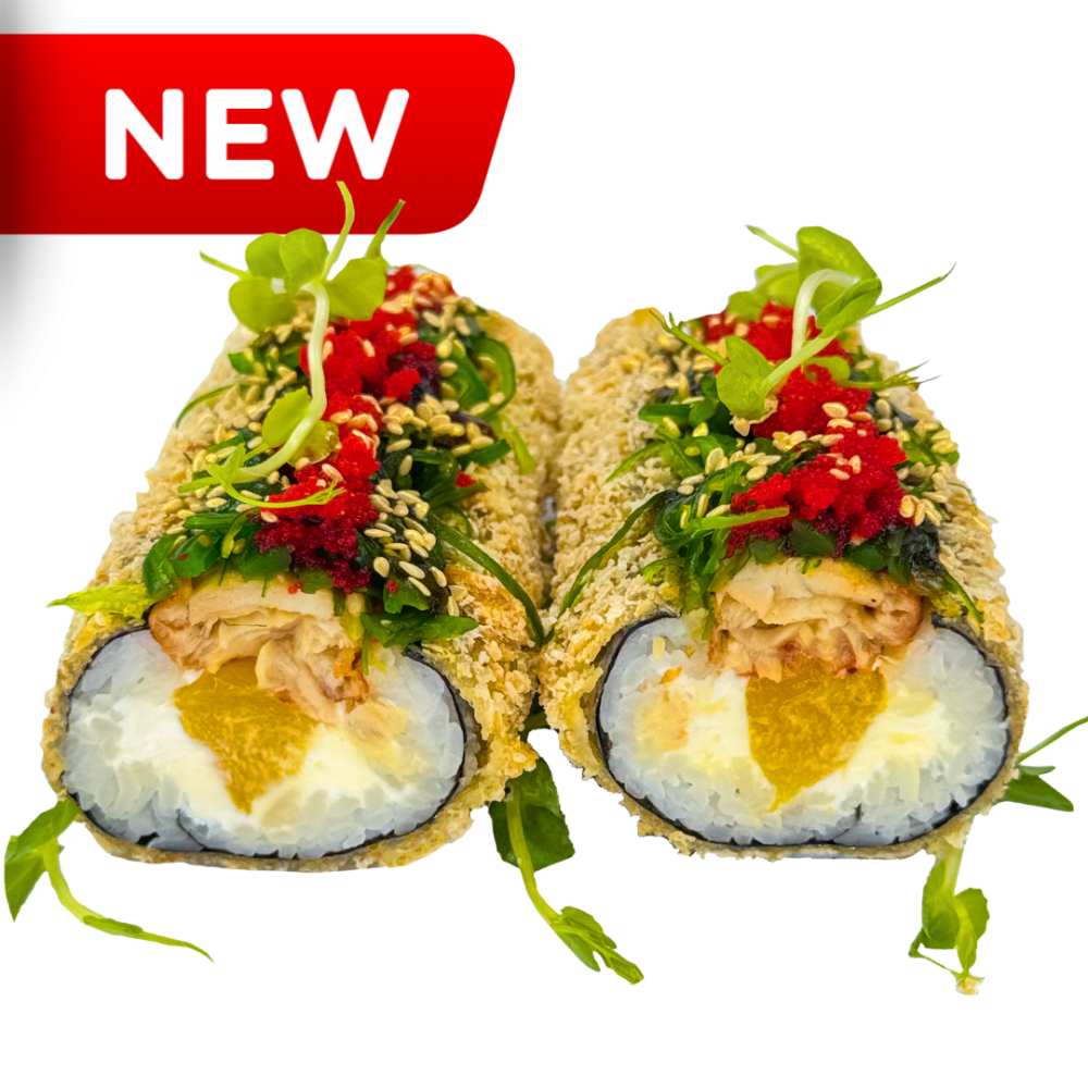 Норі, рис, крем-сир, темпура, сухарі панко, вугор смажений, манго, хіяши, ікра червона, соус Унагі, кунжут білий, мікрогрін, імбир, васабі, соєвий соус
