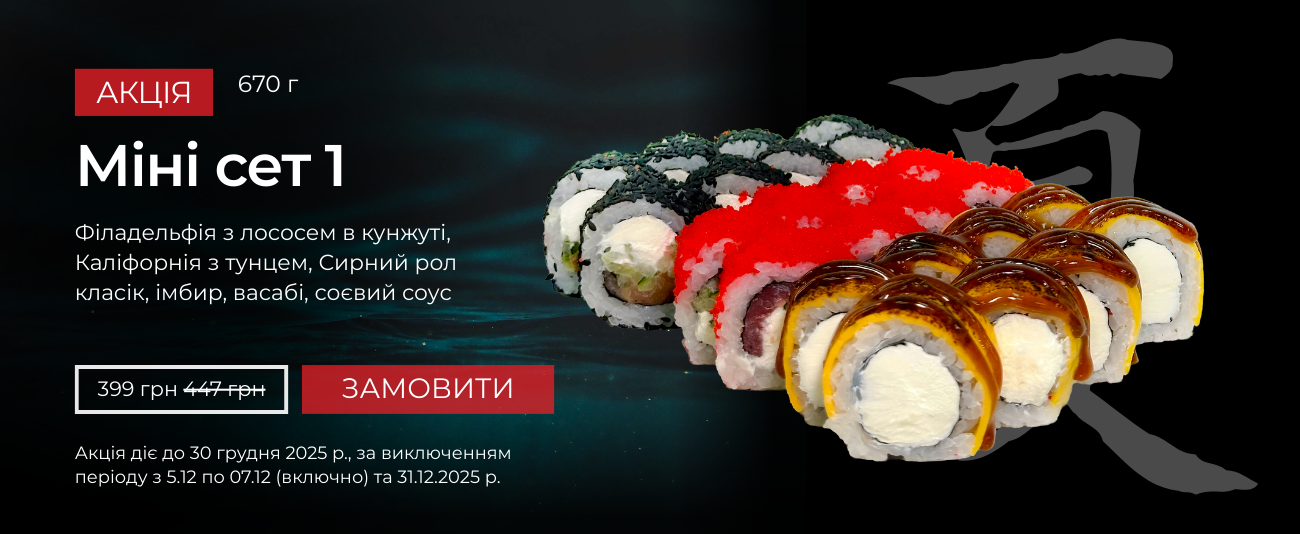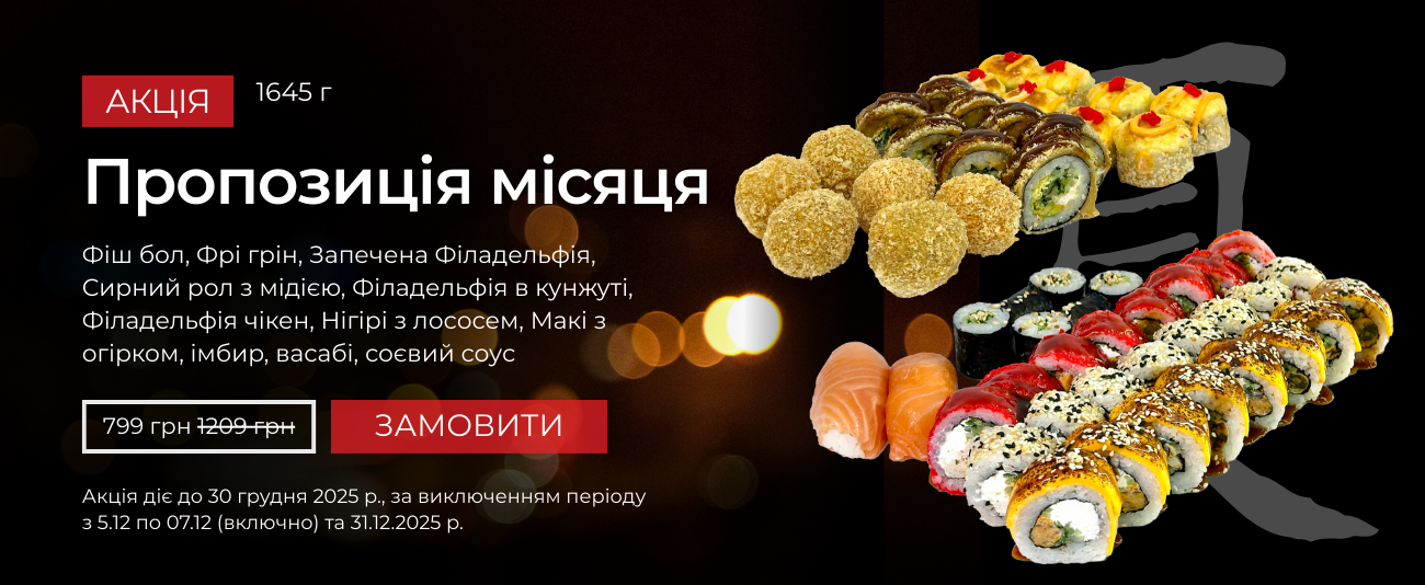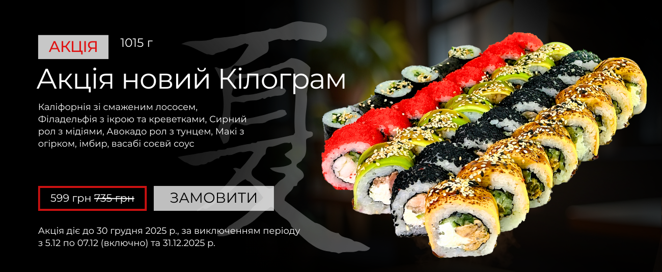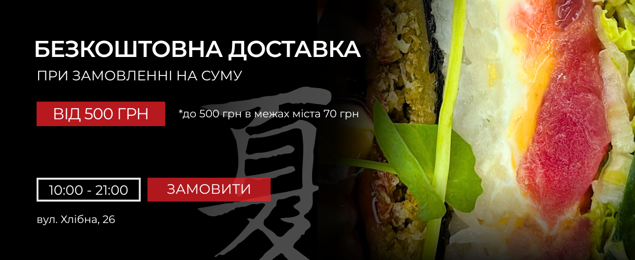 - У нашому меню страви японської кухні на будь-яких смак. Навіть будучи сильно вибагливим до їжі, ти все рівно знайдеш щось смачненьке у нашому суші-меню.