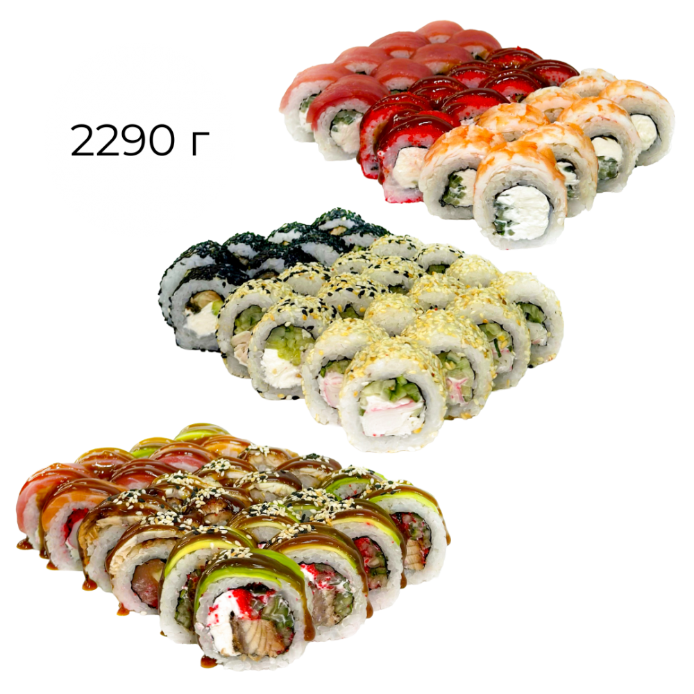 Філадельфія з креветкою, Філадельфія з тунцем, Філадельфія з ікрою та мідіями, Каліфорнія з вугрем, Каліфорнія з краб міксом, Чікен рол, Зелений змій, Серце дракона, Королівський змій, імбир, васабі, соєвий соус