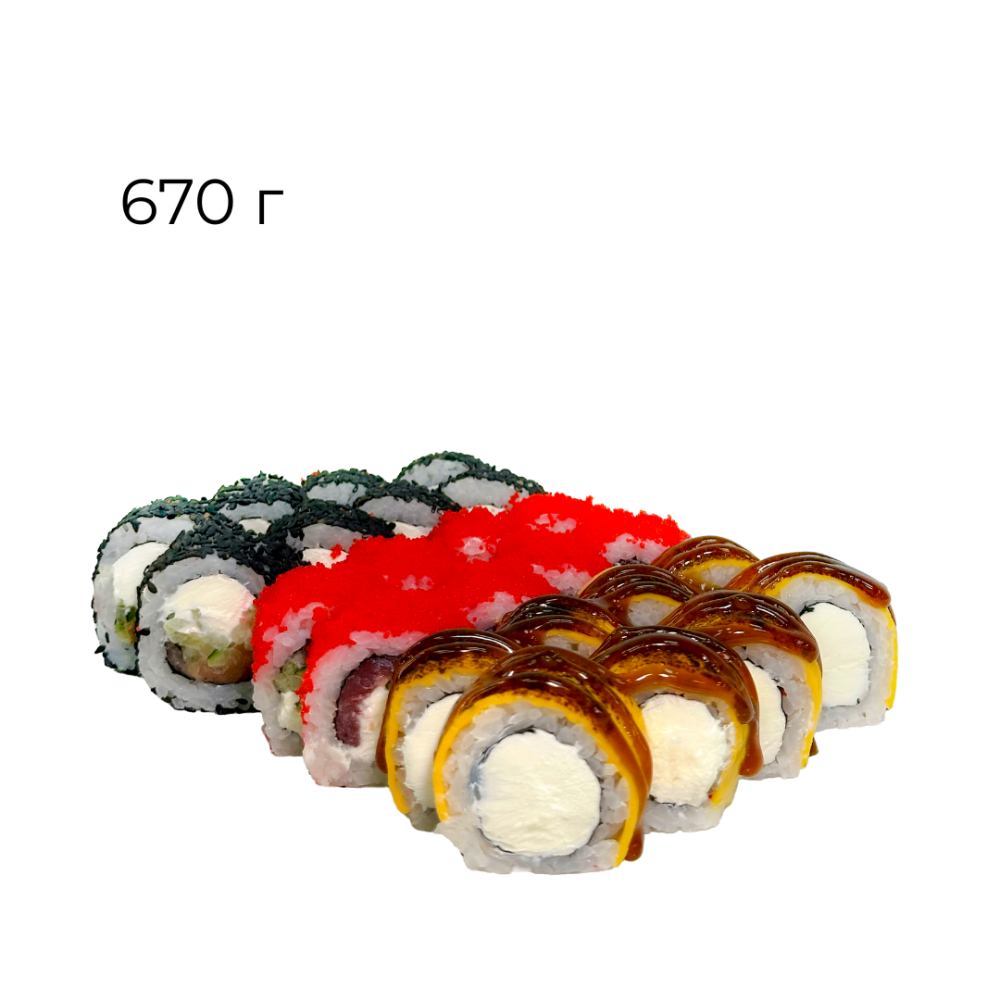 Філадельфія з лососем в кунжуті, Каліфорнія з тунцем, Сирний рол класік, імбир, васабі, соєвий соус