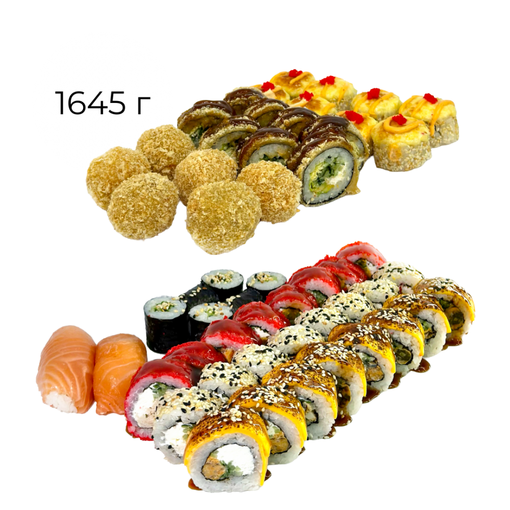 Фіш бол, Фрі грін, Запечена Філадельфія, Сирний рол з мідією, Філадельфія в кунжуті, Філадельфія чікен, Нігірі з лососем, Макі з огірком, імбир, васабі, соєвий соус